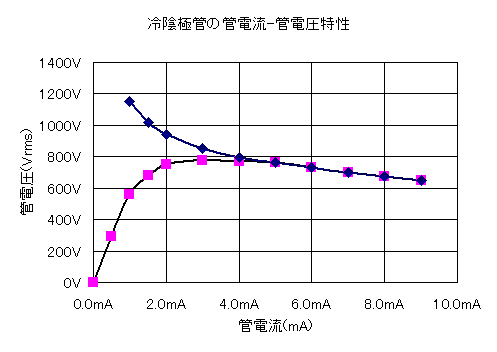 ここで、液晶バックライト組み込み時の冷陰極管の管電流−管電圧特性をもっと詳しく見てみると次のようになります。(図5)